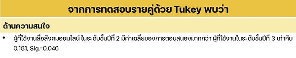จากการทดสอบสมมติฐานพบว่า : ผู้ใช้งานสื่อสังคมออนไลน์ที่มีระดับชั้นปีแตกต่างกัน มีกระบวนการตอบสนองในด้านความสนใจที่แตกต่างกัน จึงนำไปทำการทดสอบรายคู่ด้วยสถิติทดสอบรายคู่ Tukey